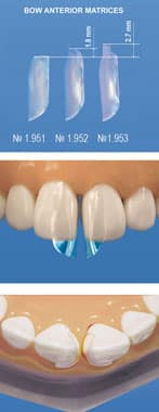 These pre-formed anterior matrices feature an anatomical bow shape that ensures correct curvature and smooth restoration margins, making them essential for esthetic anterior restorations.
