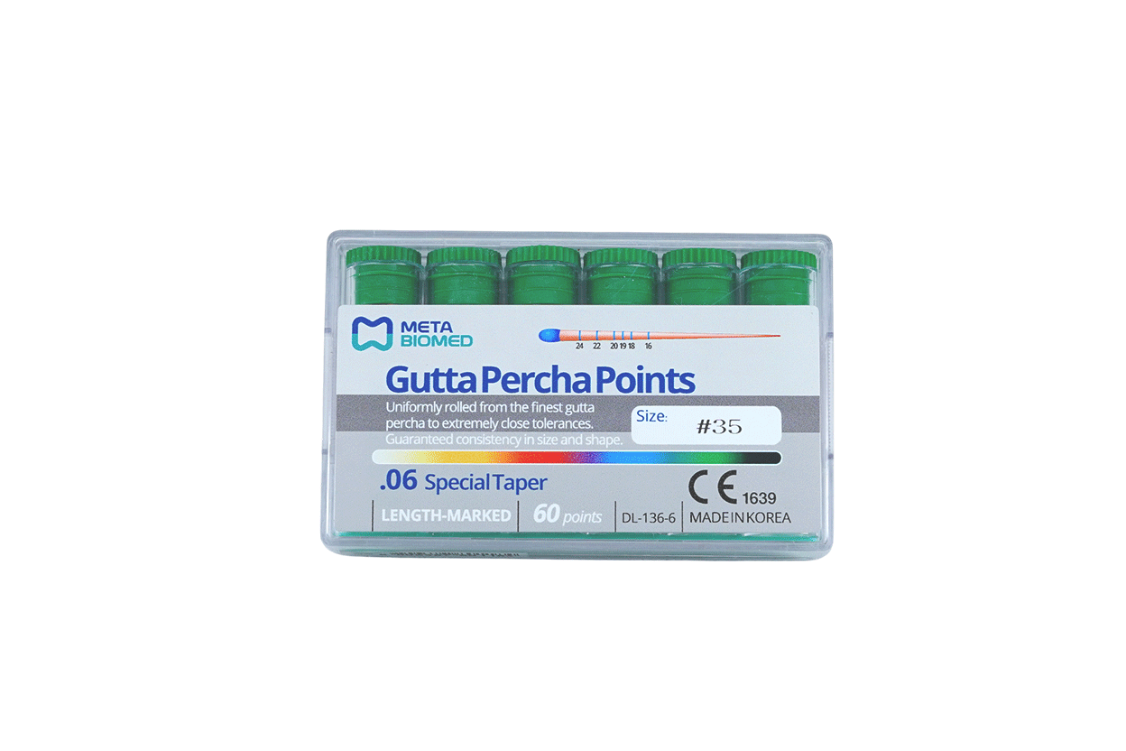 Premium Gutta Percha Points for Precise Root Canal Filling – GP 06 35-LM are high-quality endodontic obturation materials designed to ensure precise canal sealing and long-term clinical success. Manufactured by Meta Biomed, a global leader in dental biomaterials, these points deliver optimal flexibility, accuracy, and biocompatibility for consistent obturation results.