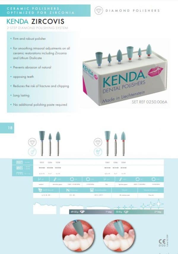 Kenda Zircovis KENDA Polishers Swiss are advanced dental polishers developed to deliver excellent finishing and high-gloss polishing for zirconia and ceramic restorations. Manufactured with Swiss precision, the offer long-lasting performance, superior control, and consistent results for professional restorative dentistry.