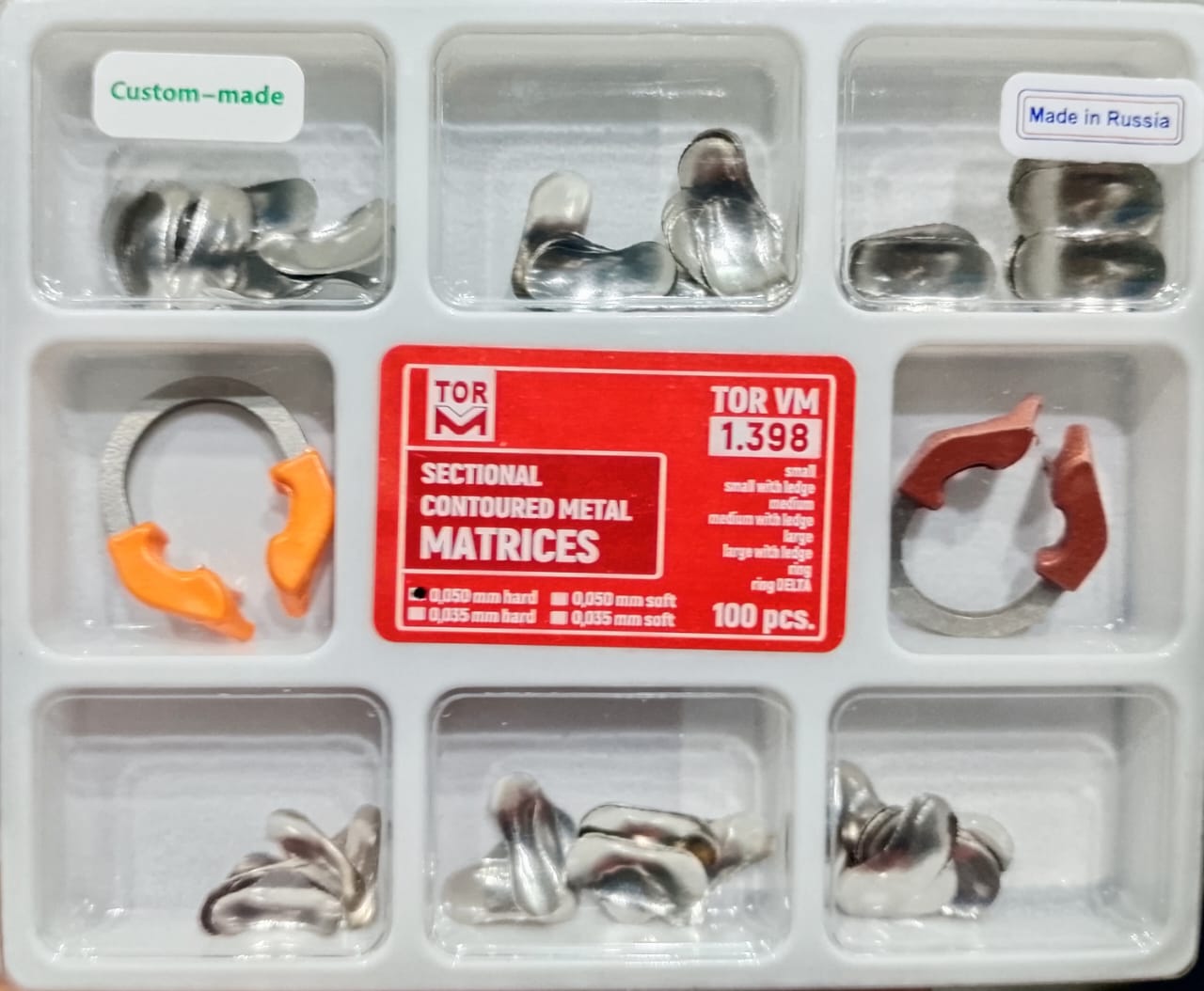 This set is a professional dental restorative system designed for Class II restorations, ensuring accurate anatomical contact points and natural tooth contour. Manufactured by TOR VM (Russia), the kit provides dentists with reliable tools for precise matrix placement and stable fixation during composite restorations.